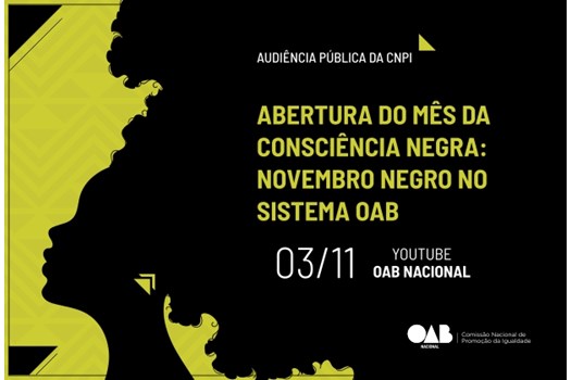A OAB Nacional, por intermédio da Comissão Nacional de Promoção da Igualdade, promoverá a Audiência Pública - Abertura do Mês da Consciência Negra - Novembro Negro no Sistema OAB. O evento ocorrerá no dia 3 de novembro, de 14 às 19h, e será transmitido em tempo real pelo canal da OAB Nacional no YouTube.